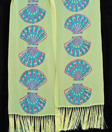 100% silk scarves from original lino-cut block prints using permanent fabric ink. Scarves with fringe please dry-clean only. Scarves without frin...