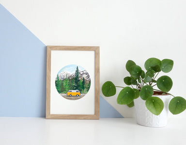 A celebration of road trip dreams and slow, scenic travel- this playful campervan illustration was originally hand-painted in gouache with a tiny b...