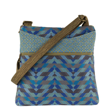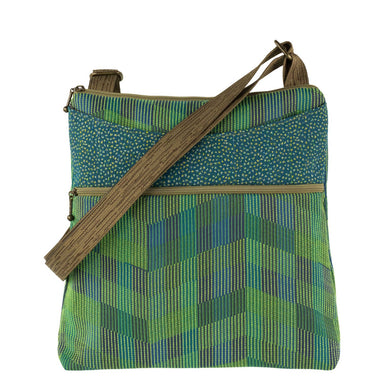 Product Description: ELLEN BAG: Leaf design on zippered front pocket zipper closure. Adjustable cross-body shoulder strap. Close-up shows bags be...