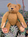 Creative visible mending vintage teddy bear, crocheted hexagons, vintage cotton thread.