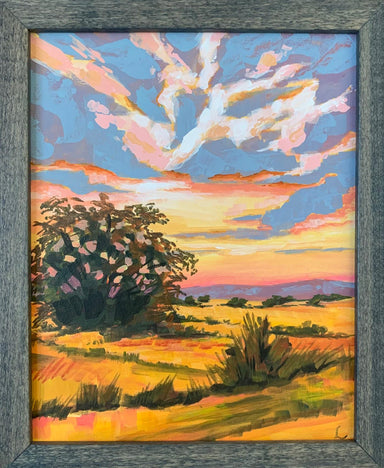 Golden Hills 20218x10 Acrylic An abstract expression of a warm sunset on a late summer day.Inspired by the golden grasses and large trees of centra...
