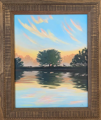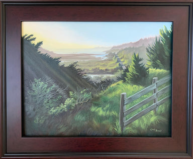 Where the River Meets the Sea 202418x14 Oil As the day comes to an end, light streams through the trees on the ridgetop. Mist from the ocean is hea...