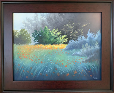 Warm Blooms on Foggy Mornings 202418x14 Oil Golden morning light comes into this pasture lighting the wildflowers. The mist wafting into the sky.