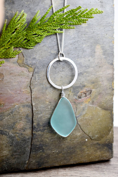 This eye catching long pendant necklace is created with sterling silver + recycled glass (eco seaglass). The glass pendant is hand-wrapped and hang...