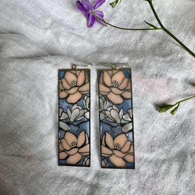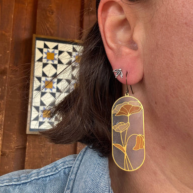 This modern earring features a brass botanical design with soft-colored resin stained glass that catches the light beautifully. Handmade with high-...