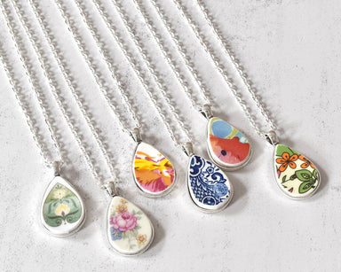 This playful necklace features recycled china framed in a 20x30mm teardrop silver-plated bezel, hanging from an 18" silver-plated chain. Since each...