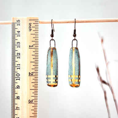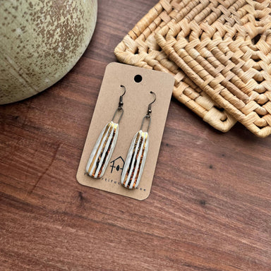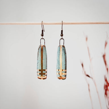 Handcrafted ceramic earrings featuring blue stripes and natural clay tones. Each pair is individually cut, kiln-fired, and hand-painted with 24K go...