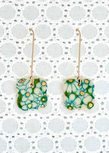 Silk screened and hand painted with underglaze these earrings are colorful, lightweight and very cute. The poppies are accented with 18k gold luste...