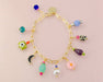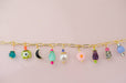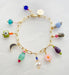 This colorful charm bracelet is made with high-quality beads in different styles, like Czech, gemstone, shell, and hand-painted beads. Each bead is chosen for its unique colors and textures. The bracelet is 7.5 inches long, but we can make it longer if you prefer. The chain is gold-plated brass. *Beads may vary slightly from photo