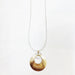 A large textured brass disc with a circle cut out, on a silver snake chain.