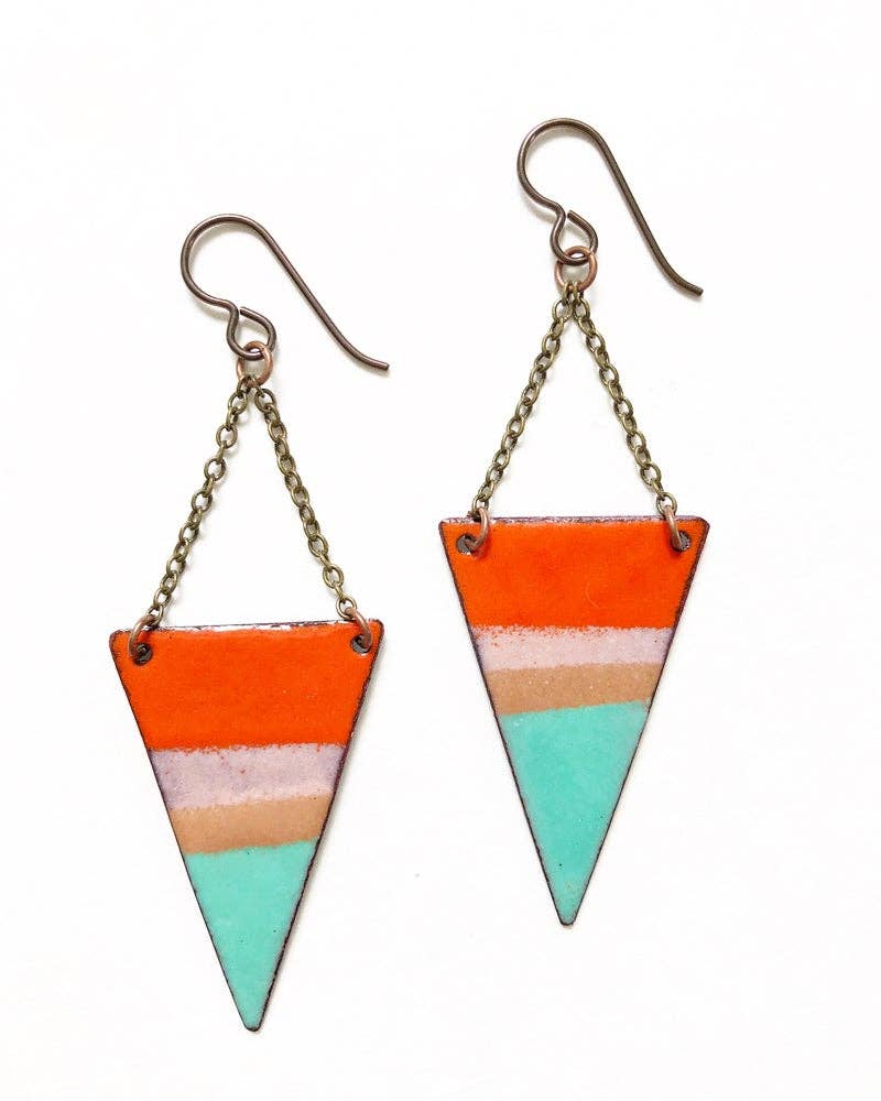 Zoom icon Click to expand Tap to zoom Chevron down icon Chevron down icon Sunset Enamel Earrings by Courtney Fischer Jewelry $ 75.00 | / 1 2 3 4 5 6 7 8 9 10+ Quantity Chevron down icon Quantity Add to cart Spinner icon This item is a recurring or deferred purchase. By continuing, I agree to the cancellation policy and authorize you to charge my payment method at the prices, frequency and dates listed on this page until my order is fulfilled or I cancel, if permitted. Enamel on copper triangle earrings. Pale pink, red, aqua, and brown enamel one side and the reverse side is chartreuse circles. The earrings measure 2 and 1/2 inches long. The triangle pendant is 3/4 inches across. Nickel free ear wire is used.