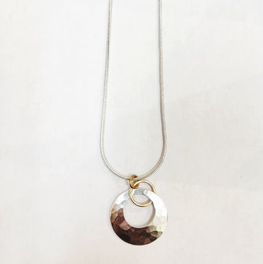 A small textured silver disc with a circle cut out, on a silver snake chain. For over 45 years, Marjorie Baer has been designing modern, sculptural...
