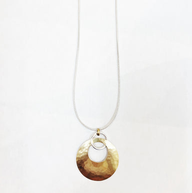 A large textured brass disc with a circle cut out, on a silver snake chain. For over 45 years, Marjorie Baer has been designing modern, sculptural ...