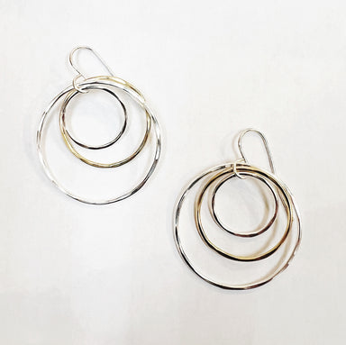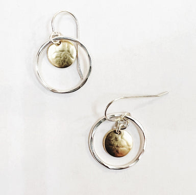 Lightly textured open golden disc element with geometric diamond cutout complemented by polished silver edging. These versatile earrings embody und...