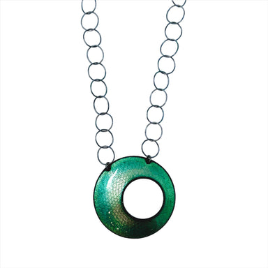 A small textured silver disc with a circle cut out, on a silver snake chain. For over 45 years, Marjorie Baer has been designing modern, sculptural...