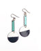 Aqua, Black, and Cream Enamel on Copper Earrings. The reverse side is chartreuse green enamel in circle design and the ear wire is copper and nickel free. A layer of lacquer seals the surface for wear. Materials: Enamel, copper. The earrings dangle 2 and 1/4" long and 1/2" wide.