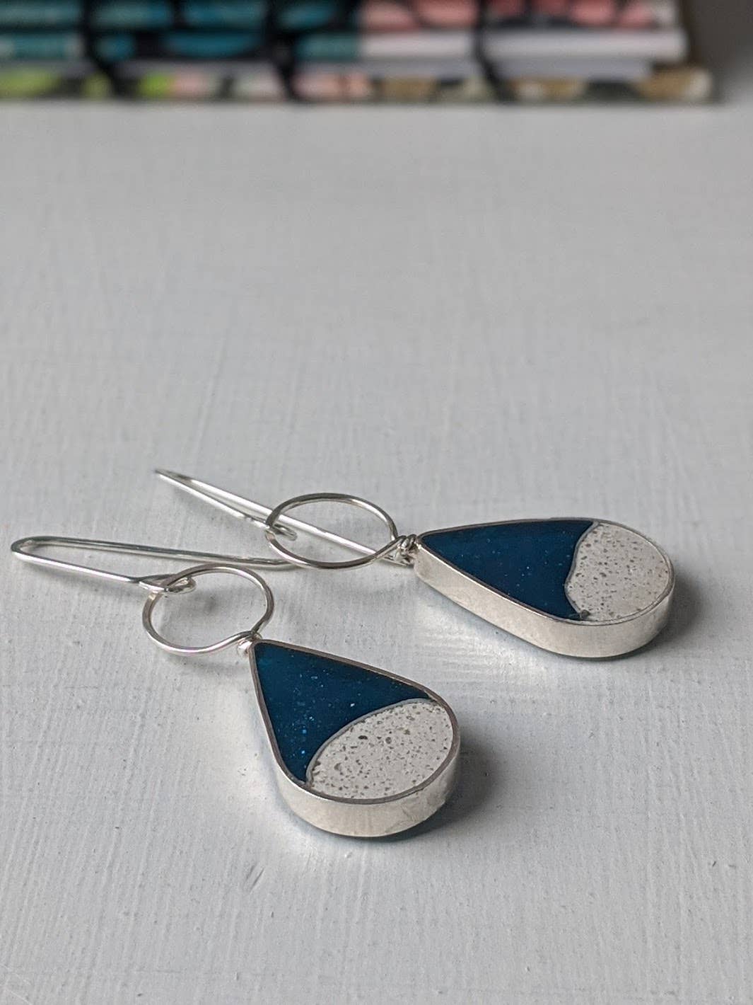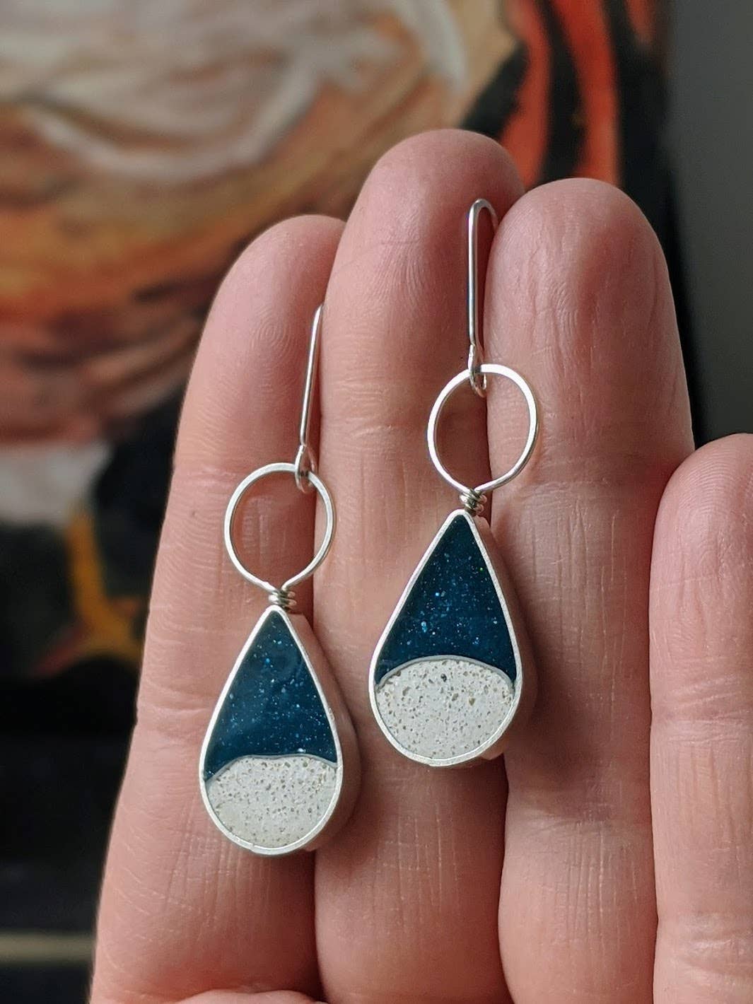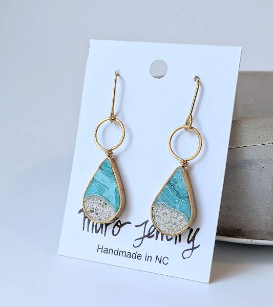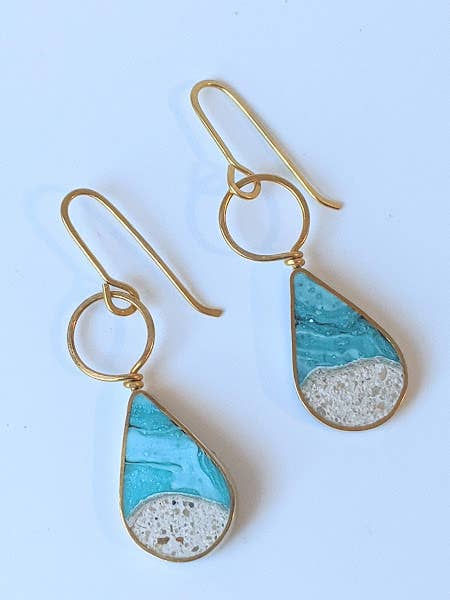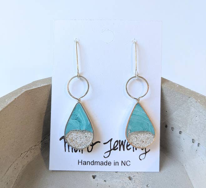 These delightfully lightweight drop earrings come in your choice of jeweler's brass or sterling silver, featuring tiny batches of turquoise eco-resin mixed with natural sand dune. Each earring measures about 1.25 inches tall and dangles roughly 1.75 inches from your ear. Handmade with love, every pair is one-of-a-kind—thanks to the eco-resin’s playful variations in color that make each set uniquely yours!