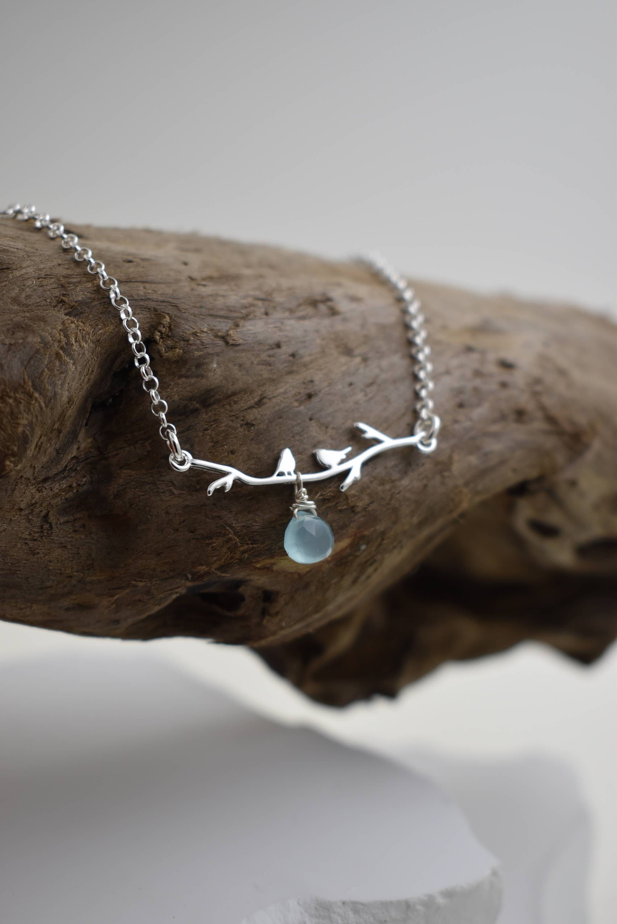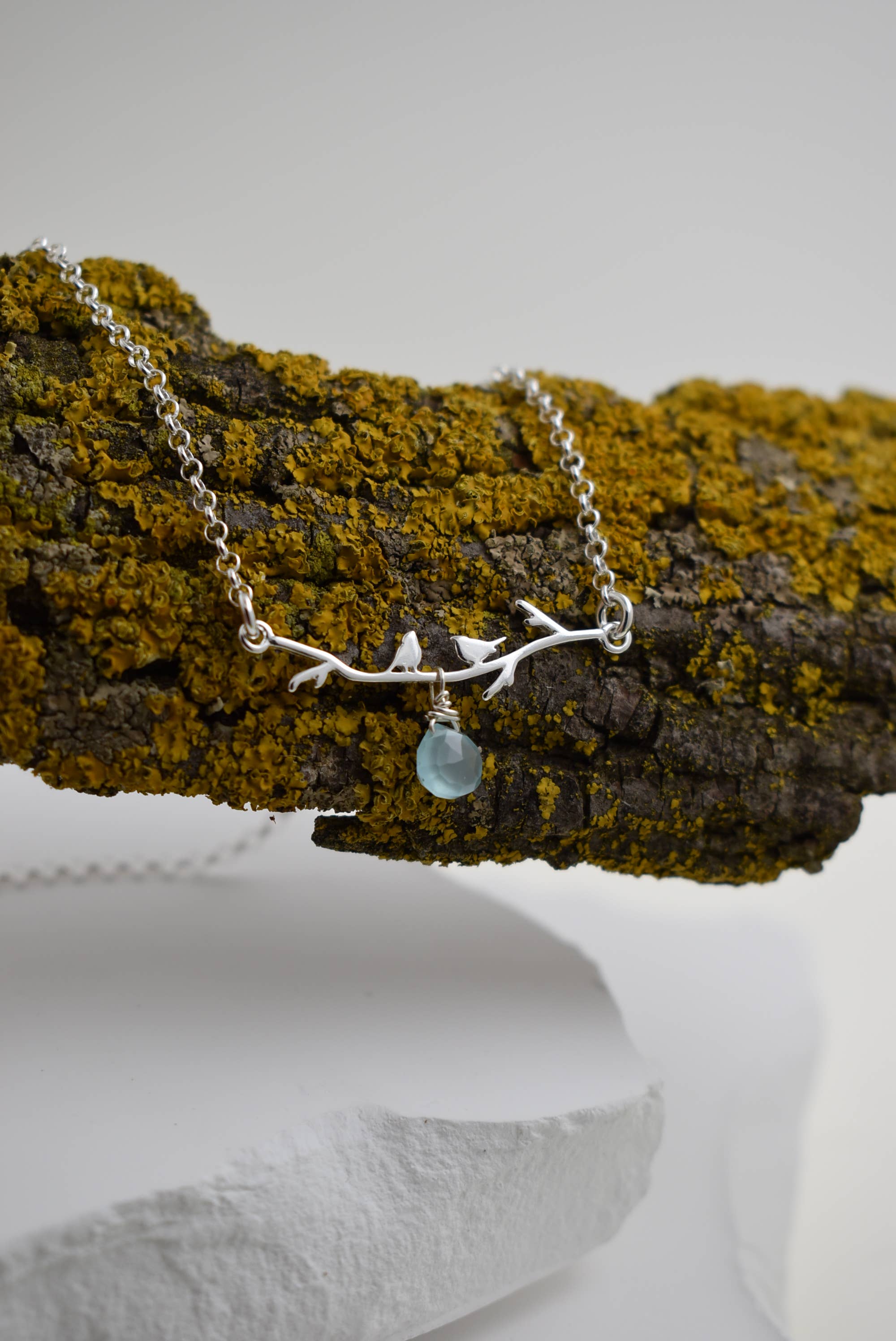 Delicate and enchanting, the Birds on a Branch Gemstone Necklace is a tribute to nature’s grace and beauty. This handcrafted necklace features two finely detailed silver birds perched on a branch, symbolizing harmony, connection, and the quiet strength found in companionship. The silver branch is elegantly curved, capturing the organic flow of nature, while the birds add a charming touch of life.
