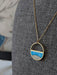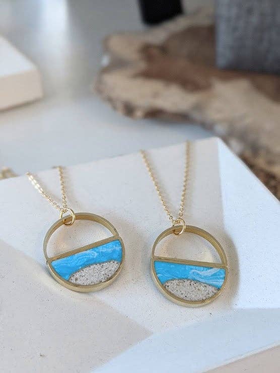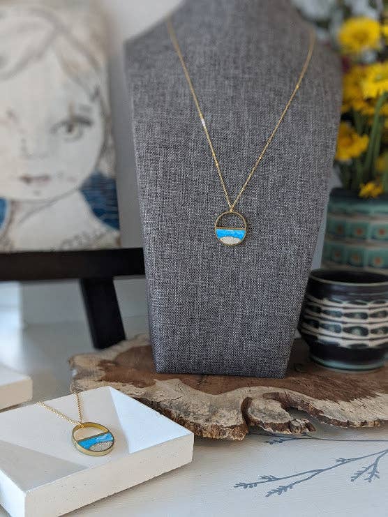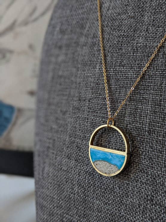 This charming half-circle necklace features jeweler's brass, vibrant turquoise eco-resin, and real sand dune accents, measuring about 1 inch by 1 inch. It dangles from an 18-inch gold-plated chain with a spring ring clasp. Handmade with love, each pendant is one-of-a-kind thanks to the eco-resin’s playful color variations—no two are exactly alike, making your necklace truly special!