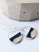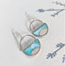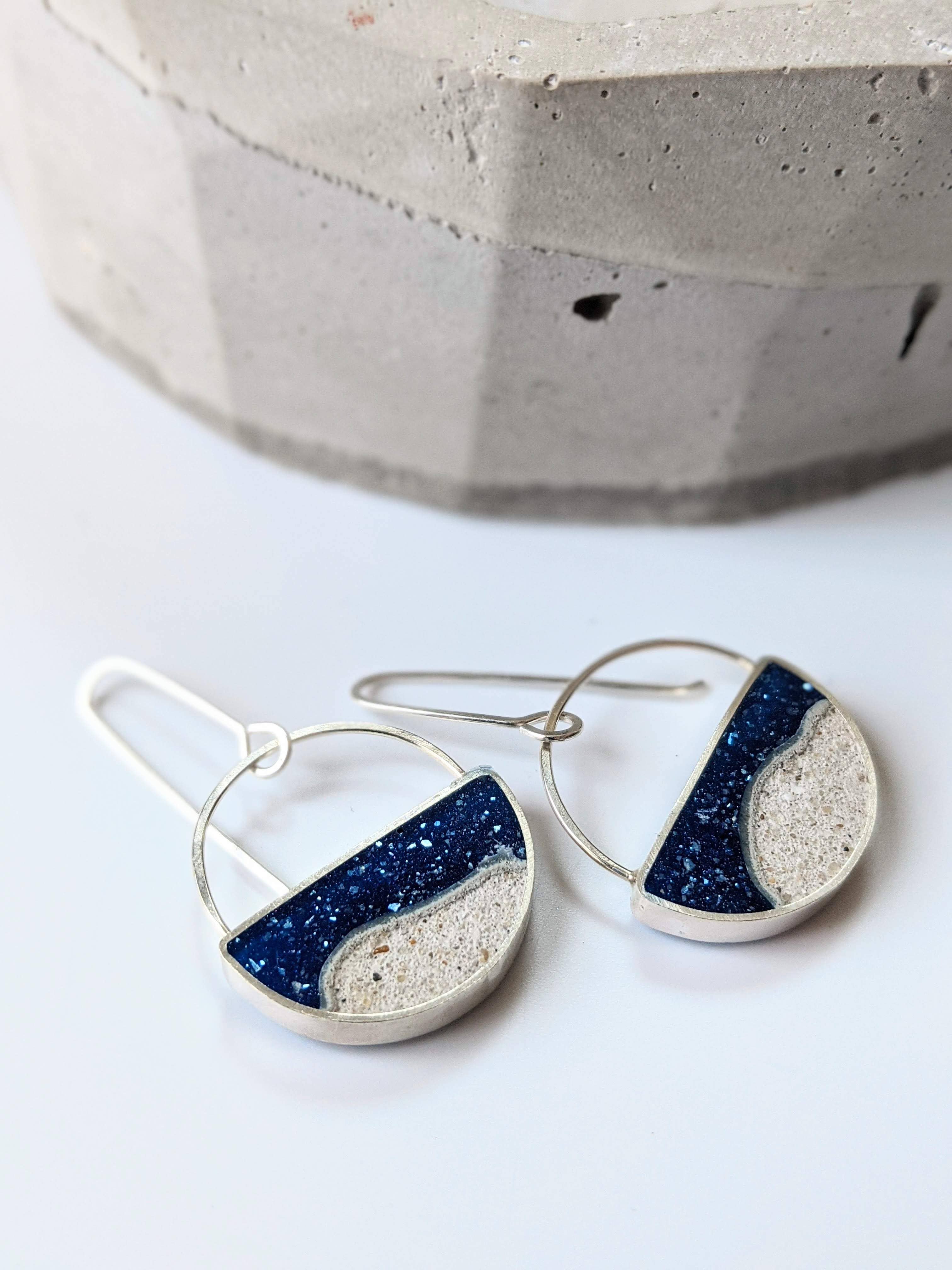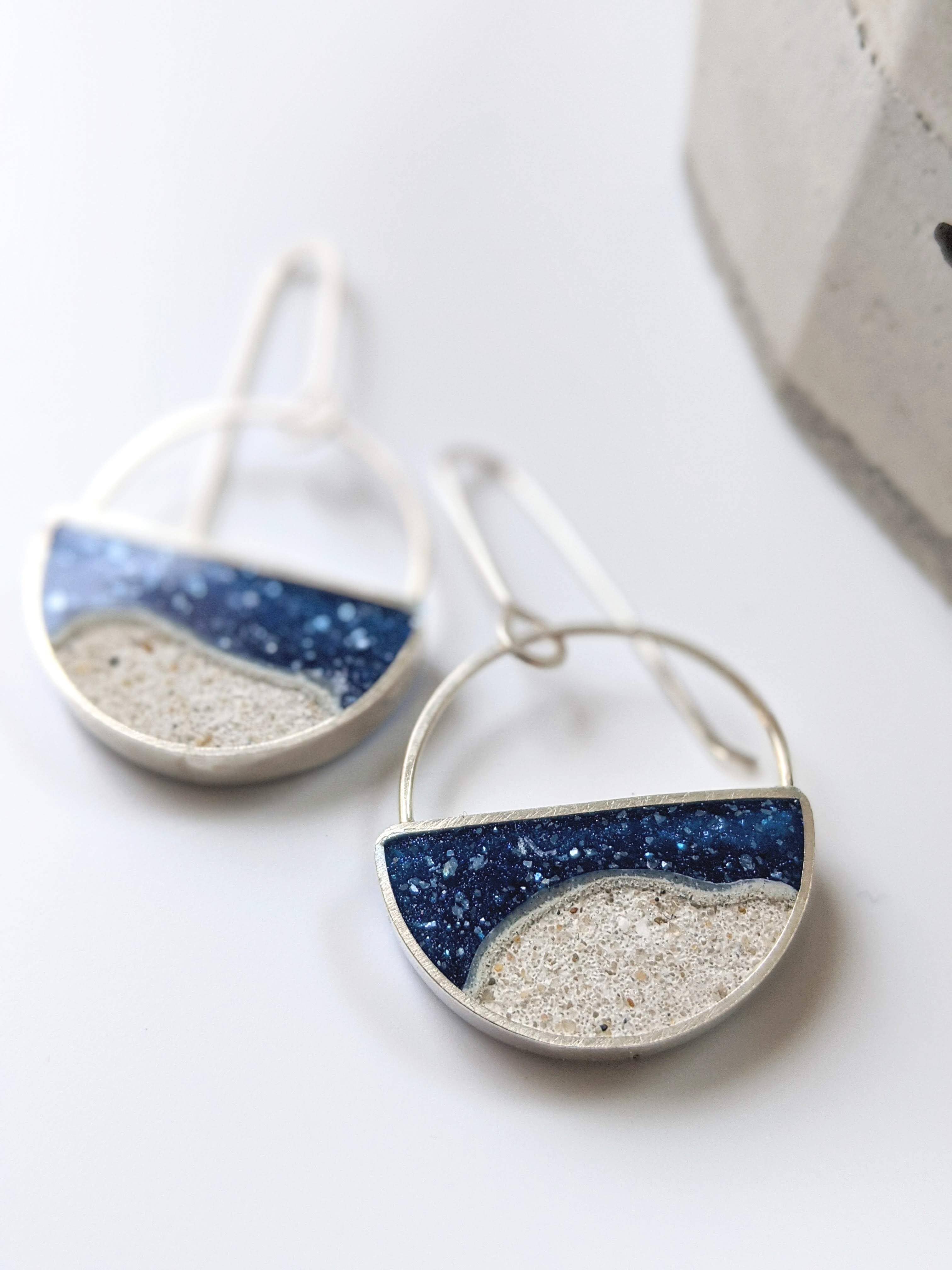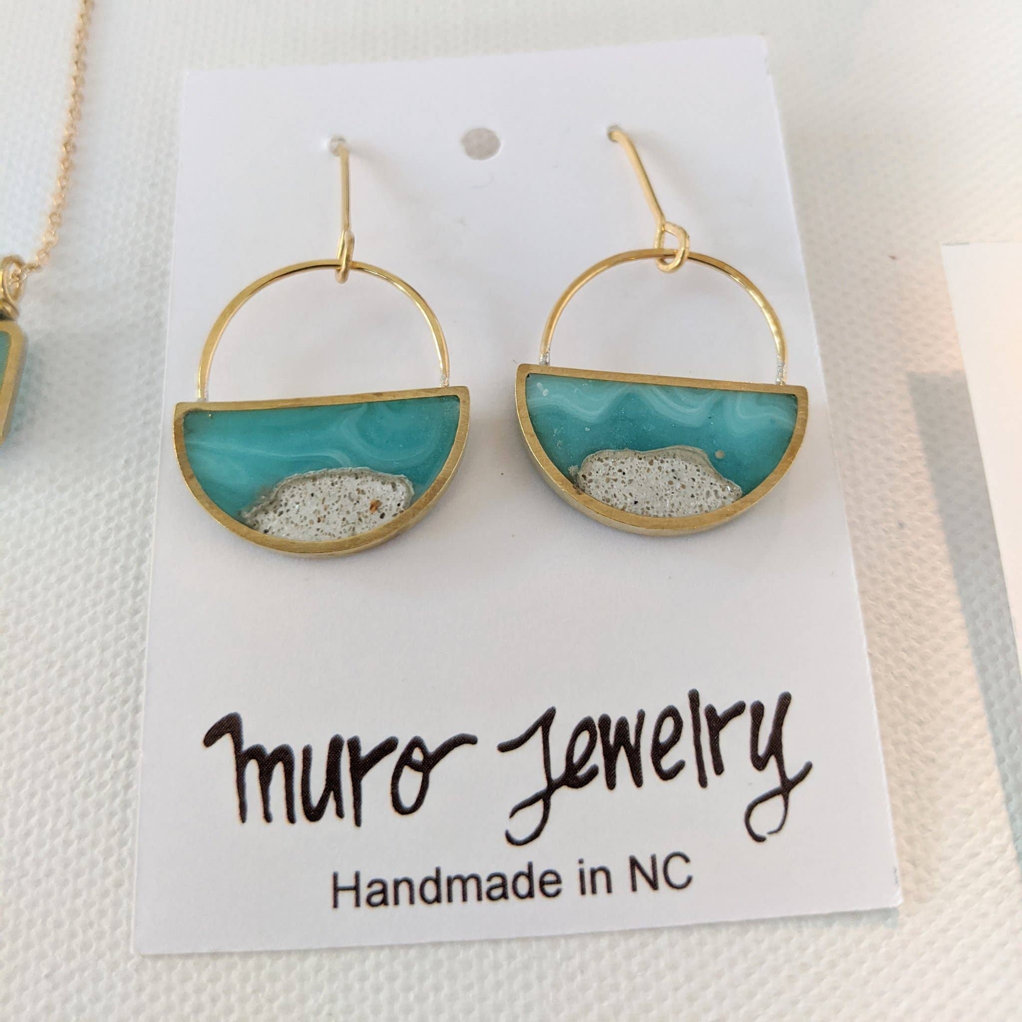 These playful half moon earrings dangle with charm, crafted from soldered wire and strip metal. Each features real beach sand and hand-colored marbled eco-resin mixed with crushed stones and silver flecks, all set in a handmade bezel. Every pair is uniquely yours, with variations in turquoise blue resin that make each one truly special. Measuring about 1.5 inches long and 0.5 inches wide, they combine eco-resin, sand, brass, and sterling silver for a whimsical touch of nature and sparkle.