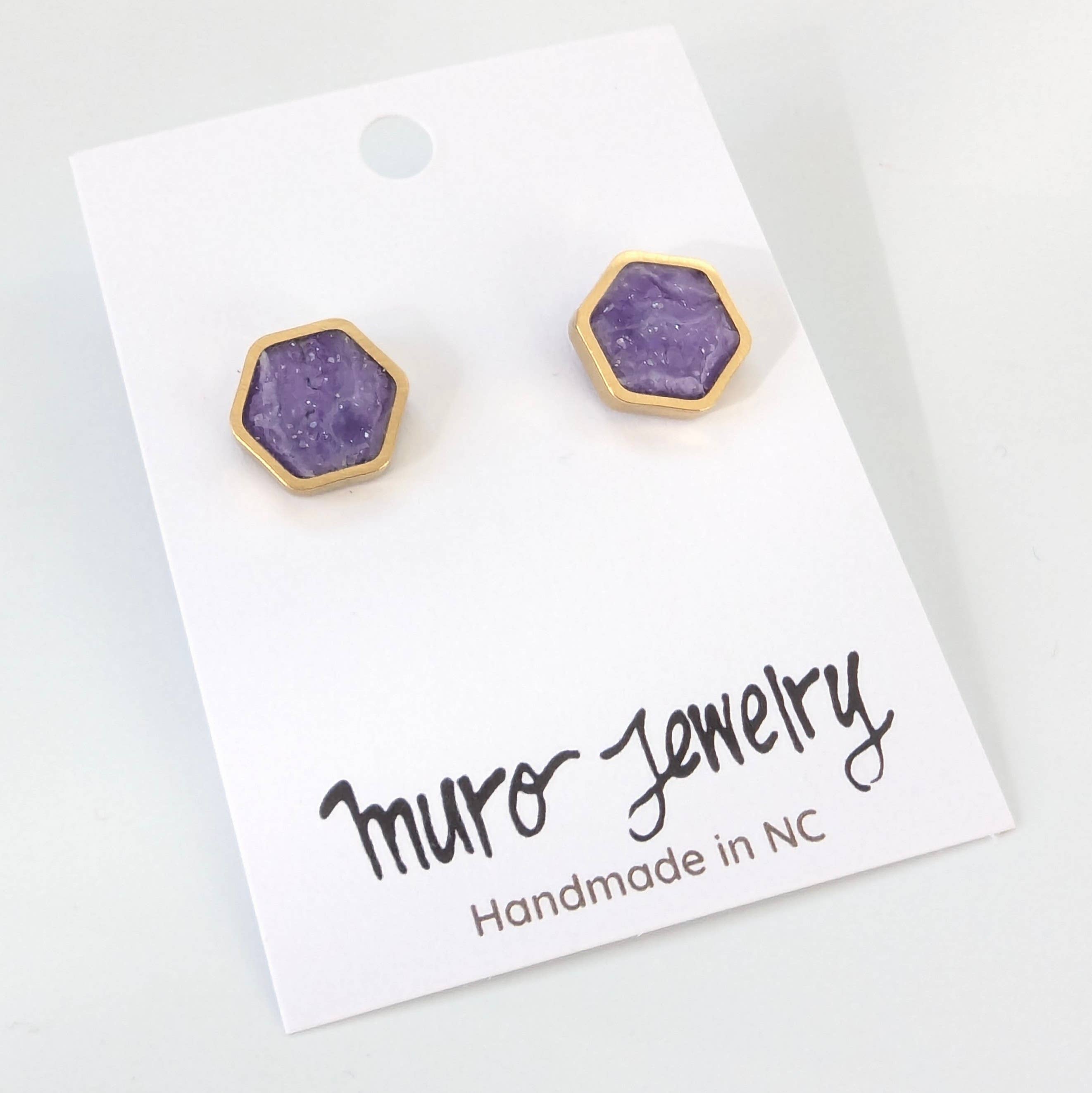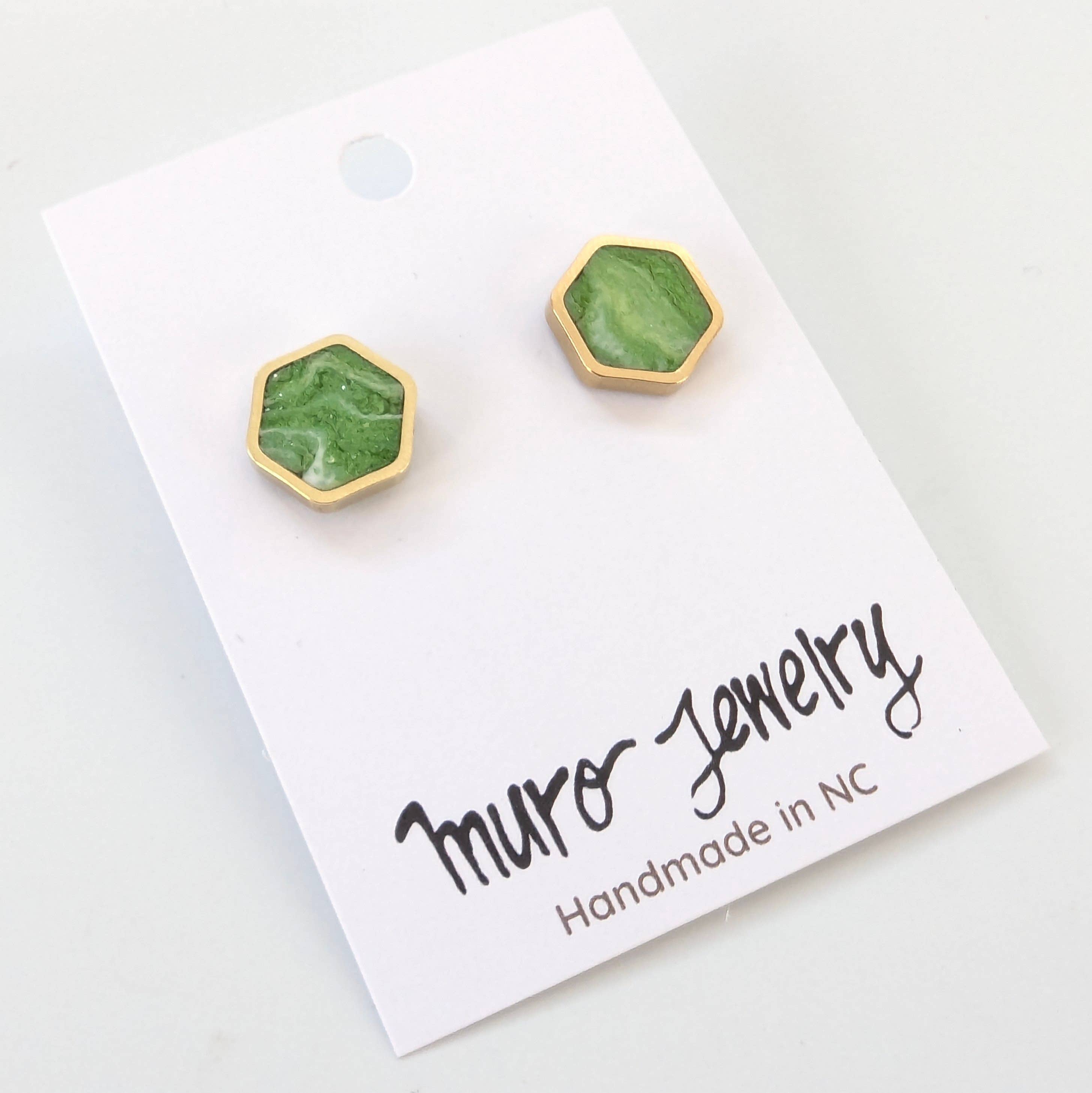 Hexagon Eco-resin Posts These handmade Hexagon Eco-Resin post earrings are made from eco resin, jeweler's brass, and sterling silver posts. A signature mix of colored eco-resin and silver sparkles is hand-poured into each piece, creating a simple yet sophisticated look in the earrings. The posts are made in sterling silver. Every piece is handmade by me in my studio in North Carolina. Please note, as these earrings are handmade, slight variations may occur, making each pair truly unique.ย