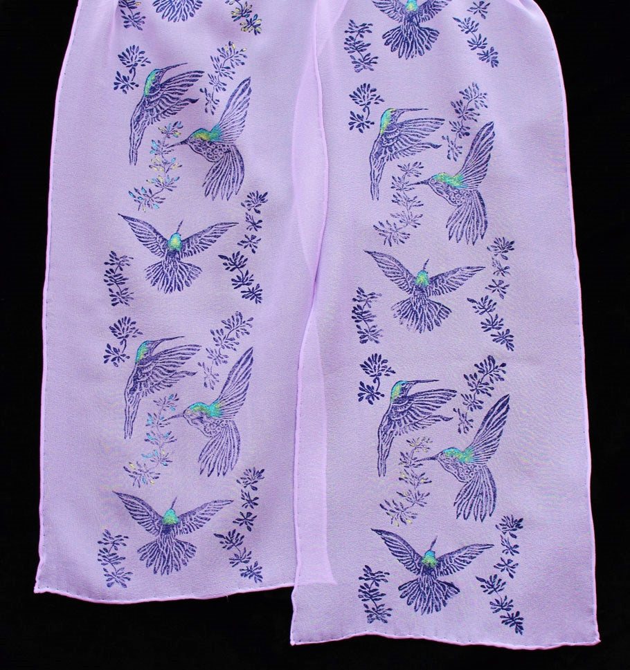 100% silk scarves from original lino-cut block prints using permanent fabric ink.  Scarves with fringe please dry-clean only.  Scarves without fringe may be hand-washed in cold water.  Iron on wrong side using a silk setting.  Made in Santa Cruz by artist Jody Bare.