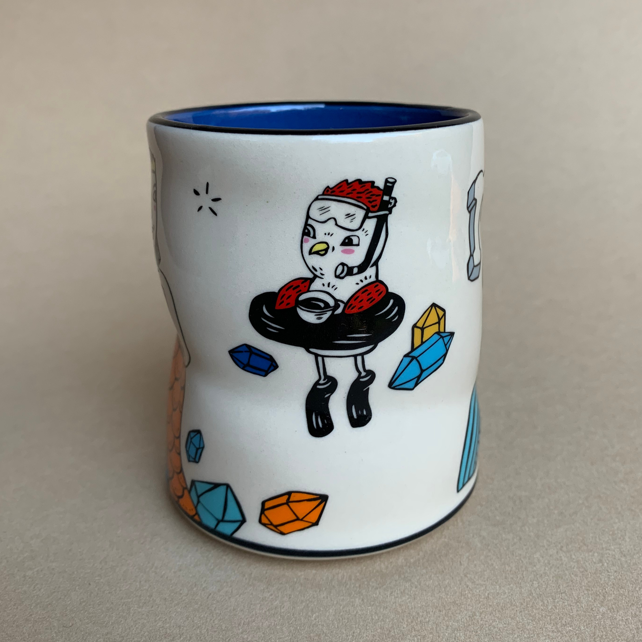 To Love and Water! I grew up with a mother that was for all I know part mermaid. I spent my summers either in the ocean, in a lake and in a pool. Her land body ended up in a wheelchair by age 65, but when in water- she was free. Her best friend, Karin of New Jersey, is also a mermaid. She has taught hundreds of children to swim and love being in water. The mermaid cup design came from an original bowl I made as a portrait of them. Art on all sides. Comfortable to hold with a unique thumb. The wares are food, microwave, and dishwasher safe, as well as family and café proven strong.Designed in my Washington State studio, made in Thailand in a facility meets European standards for people and planet.