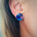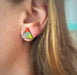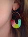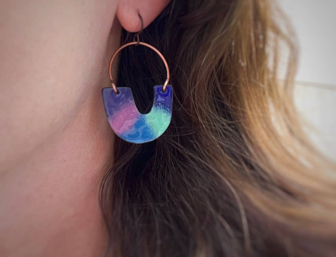 Enamel on copper earrings. Colorful enamel on half moon shapes dangle from copper wire. The posts are surgical steel and nickel free. The earrings measure 2 inches long.