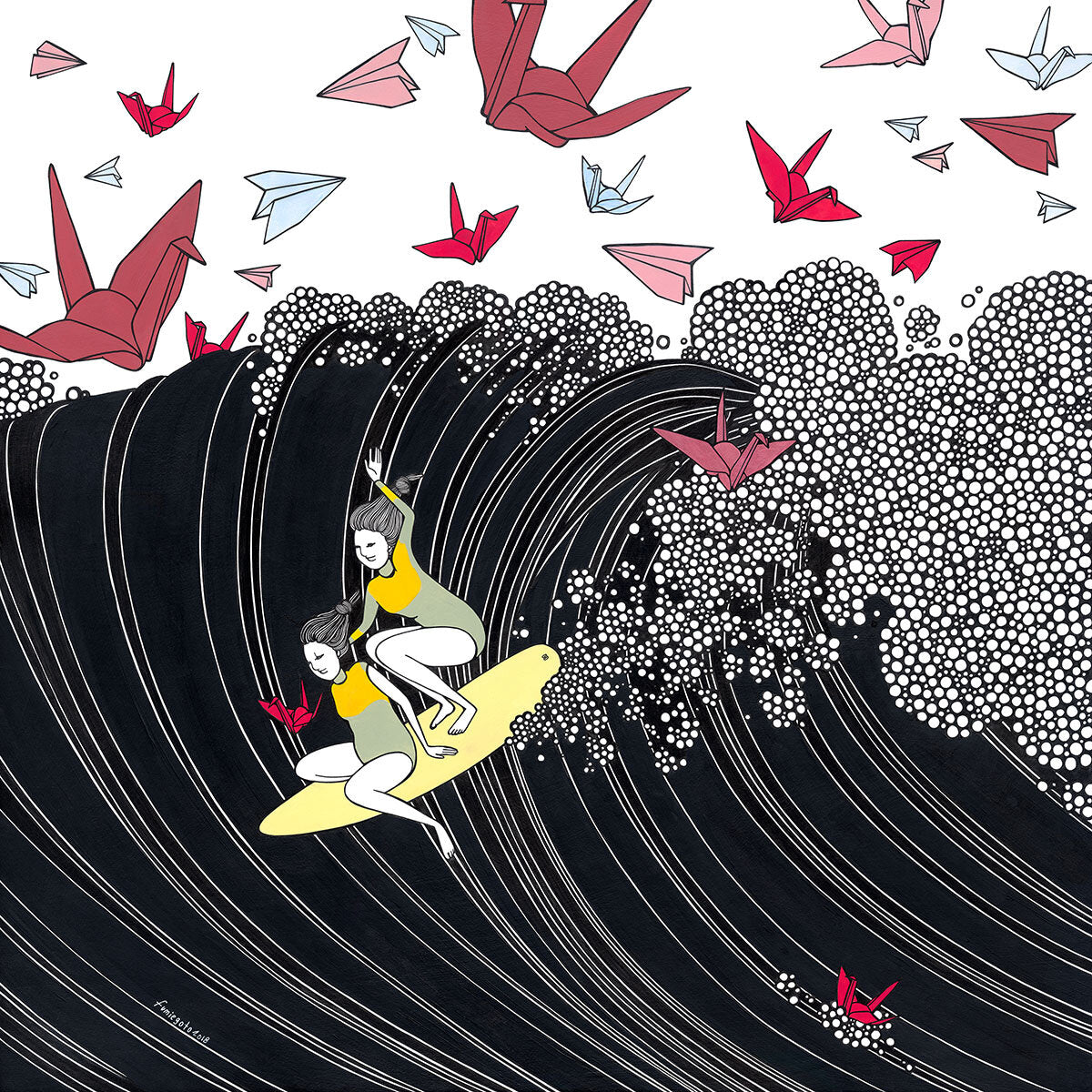 "Party" is inspired by the Japanese tradition of origami folding and the surf culture here in Hawaii. Part of the Planes, Cranes and Sea series, it depicts a journey of two friends, the start of their friendship to the end.