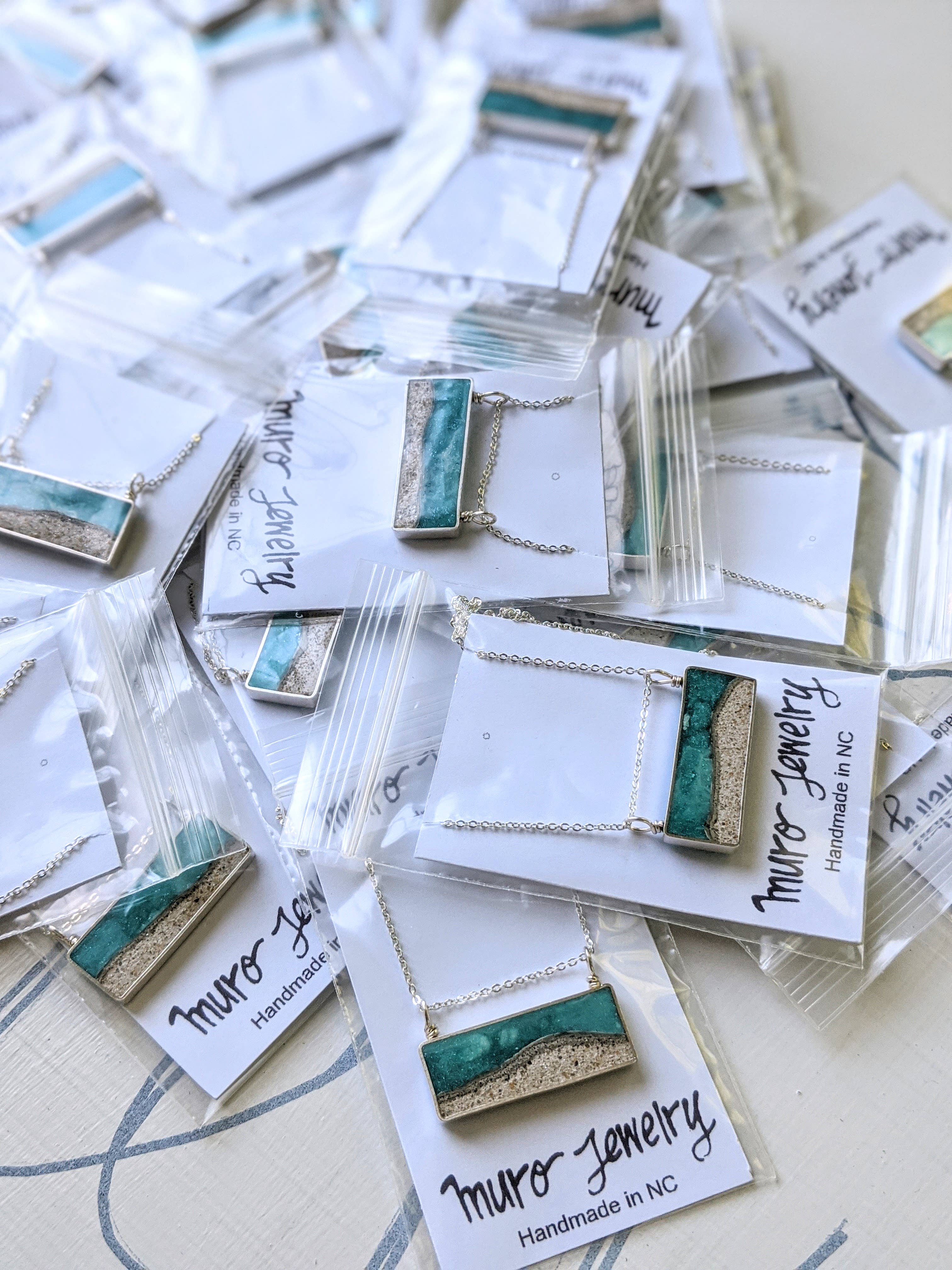 Capture the essence of sunny beach days with this playful sterling silver necklace. Handmade with real sand collected from memorable beach trips, each pendant features a unique turquoise resin wave that perfectly complements the sandy shore. Slight variations in color and sand patterns make every necklace one-of-a-kind. Measuring about 1.125 by 0.5 inches, it hangs from an 18-inch sterling silver chain with a spring clasp—ready to bring a splash of seaside charm to your look.
